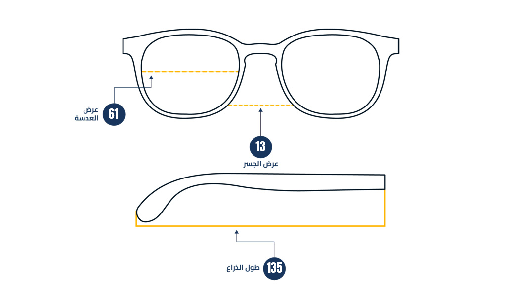 يمكنك رؤية بعض الأرقام المطبوعة أو المنقوشة على داخل ذراعي نظارتك أو خلف منطقة جسر الأنف. استخدم 54-16-140 كمثال. الرقم الأول، 54، يمثل عرض العدسة؛ الرقم الثاني، 16، يشير إلى عرض الجسر، بينما الرقم الأخير، 140، هو طول الذراع. في بعض الأحيان يوجد رقم رابع يشير إلى ارتفاع العدسة. هذه الأرقام تأتي بمثابة مرجع لك لاختيار الإطارات التي تناسبك بشكل أفضل.