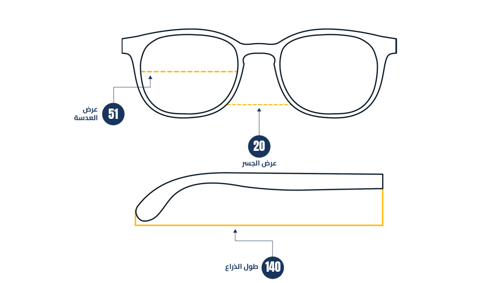 يمكنك رؤية بعض الأرقام المطبوعة أو المنقوشة على داخل ذراعي نظارتك أو خلف منطقة جسر الأنف. استخدم 54-16-140 كمثال. الرقم الأول، 54، يمثل عرض العدسة؛ الرقم الثاني، 16، يشير إلى عرض الجسر، بينما الرقم الأخير، 140، هو طول الذراع. في بعض الأحيان يوجد رقم رابع يشير إلى ارتفاع العدسة. هذه الأرقام تأتي بمثابة مرجع لك لاختيار الإطارات التي تناسبك بشكل أفضل.